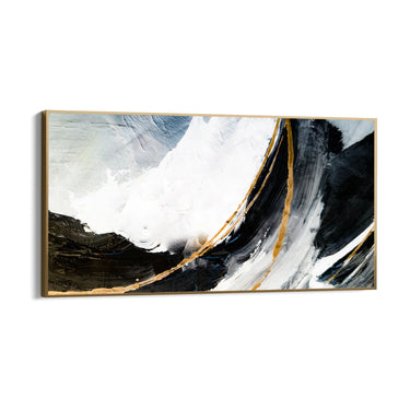Този печат върху платно, озаглавен "Мистицизъм на контраста", е абстрактно произведение на изкуството, което привлича окото със своята динамична игра на цветове и форми. Композицията представя комбинация от чисто бяло, дълбоко черно и златни акценти, които се сливат в плавни извивки и решителни щрихи.