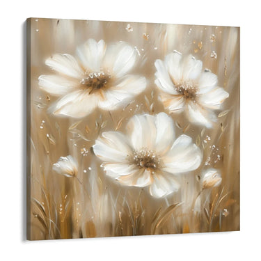 Доминиращите цветове са бялото на цветята, което хармонично контрастира със златистите и бежови нюанси на фона. Тези топли тонове създават уютна и релаксираща атмосфера, перфектна за всяко домашно или професионално пространство.