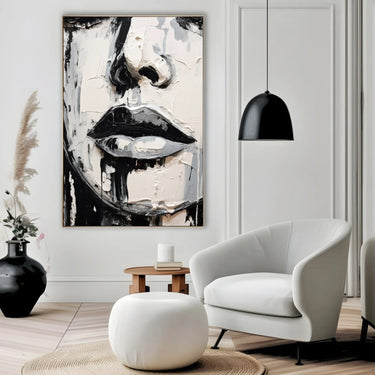 "Очарование в черно и бяло" е печат върху платно, който улавя същността на модерното изкуство чрез умелото използване на монохромни цветове. Този шедьовър представя частично видимо лице, с особен акцент върху устните и носа, изрисувани с решителни щрихи и дебели текстури.