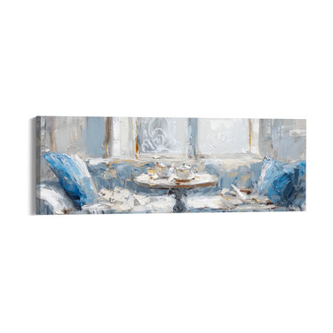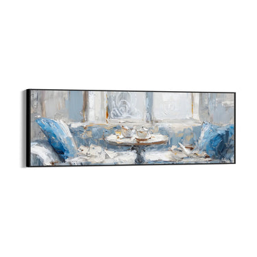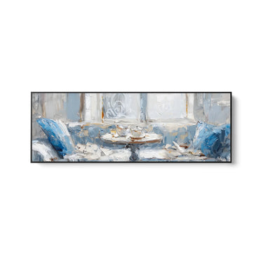 Този печат върху платно, озаглавен "Рефлекси от стъкло", улавя същността на елегантна всекидневна с подредена маса. Сцената е потопена в тонове на синьо и бяло, създавайки спокойна и изискана атмосфера. Нежните цветове и меки щрихи предизвикват усещане за спокойствие и изтънченост.