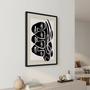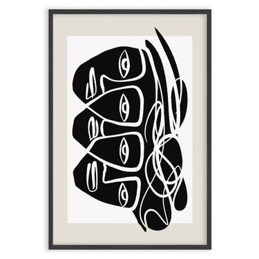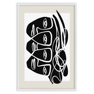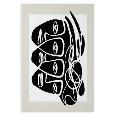 Плакатът "Sussurri Orbitali" е абстрактно произведение на изкуството, което привлича вниманието със своя уникален и интригуващ дизайн. Композицията е доминирана от стилизирани фигури на лица, характеризирани с дебели черни линии и загадъчни очи, които сякаш наблюдават зрителя от различни ъгли. Извити и преплетени линии добавят щрих на динамика и движение към изображението.