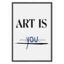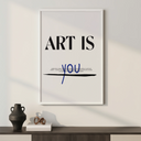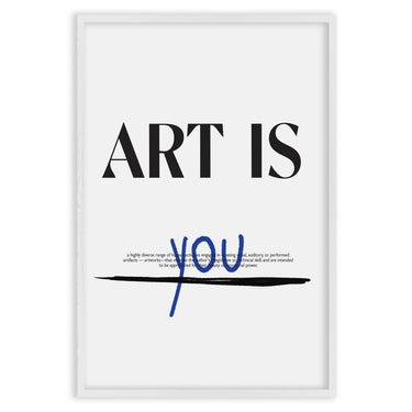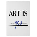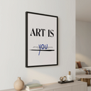 Плакатът "Ти си изкуство" е визуално произведение, което празнува индивидуалността и личното изразяване. В центъра на дизайна, с дебели черни букви, се чете фразата "ART IS", докато думата "YOU" е написана на ръка в синьо, създавайки жив и динамичен контраст. Под думата "YOU" има хоризонтална черна линия, която добавя елемент на акцент и разделение.