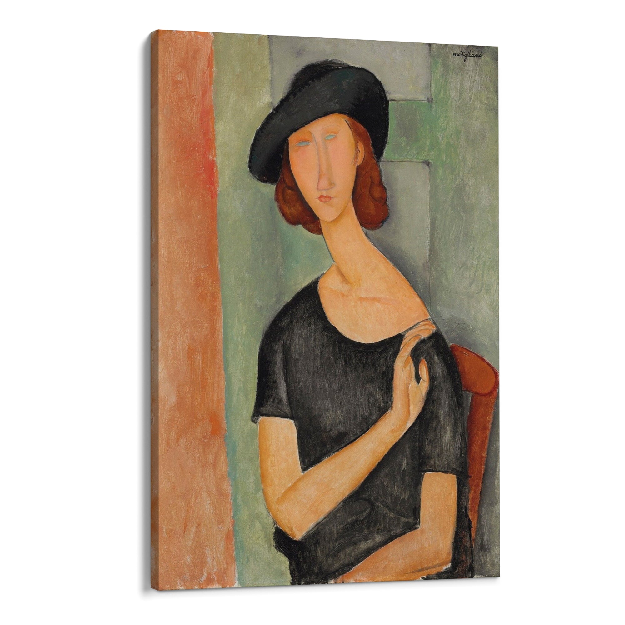 Questa stampa su tela rappresenta "Jeanne Hébuterne" di Amedeo Modigliani. Il dipinto raffigura una donna con un lungo collo sinuoso, tipico dello stile di Modigliani, seduta su una sedia. Indossa un cappello nero e un abito scuro che contrastano con il suo incarnato pallido.