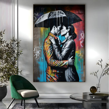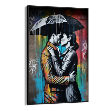 Il quadro "Bacio Graffiti" è una stampa su tela che cattura un momento di intimità e passione tra due amanti sotto la pioggia. La scena è resa ancora più suggestiva dall'uso di un ombrello che li protegge dalle gocce d'acqua, simbolo di protezione e connessione.