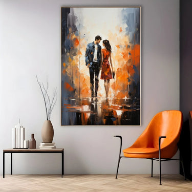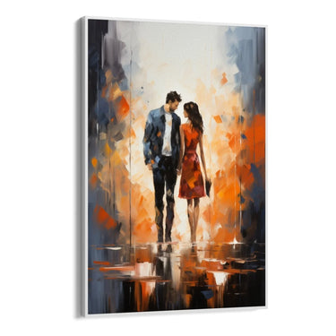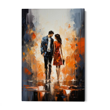 "Questione di Sguardi" è una stampa su tela che cattura un momento intimo tra due persone. La scena raffigura una coppia che cammina insieme, immersa in un'atmosfera calda e avvolgente. I loro sguardi si incontrano, creando un senso di connessione e complicità.