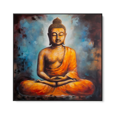 I colori predominanti sono il blu e l'arancione. Lo sfondo blu crea un contrasto perfetto con la veste arancione del Buddha, enfatizzando la sua presenza e rendendo l'immagine vibrante e dinamica. Le tonalità calde dell'arancione aggiungono un tocco di energia e vitalità al quadro.