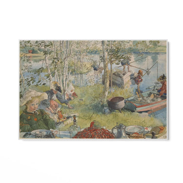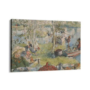"Pesca dei Gamberi" di Carl Larsson è una stampa su tela che cattura un momento di vita quotidiana in un ambiente naturale. La scena raffigura un gruppo di persone impegnate nella pesca dei gamberi vicino a un corso d'acqua. L'artista utilizza colori tenui e naturali, come il verde delle foglie e dell'erba, il blu dell'acqua e il rosso dei gamberi, per creare un'atmosfera serena e armoniosa.