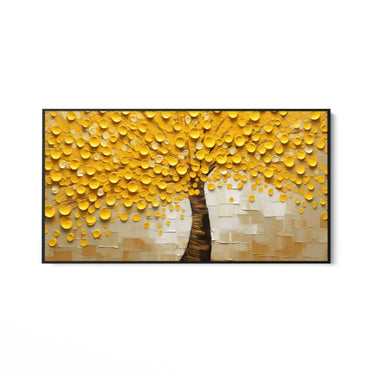 La composizione del quadro mette in risalto un albero con un tronco robusto e scuro, che si erge maestoso al centro della tela. I rami si espandono in una chioma rigogliosa di foglie dorate, simbolo di abbondanza e prosperità. Lo sfondo neutro, con toni di beige e bianco, permette alle foglie dorate di risaltare ancora di più, creando un contrasto affascinante.