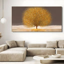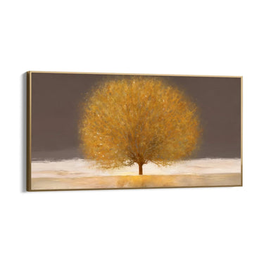 I colori predominanti nel quadro sono il dorato e il marrone. Il dorato delle foglie dell'albero crea un contrasto affascinante con lo sfondo scuro, mentre le tonalità più chiare del terreno e del cielo aggiungono profondità e dimensione alla composizione. Questi colori caldi e accoglienti rendono il quadro ideale per qualsiasi ambiente, aggiungendo un tocco di eleganza e raffinatezza.