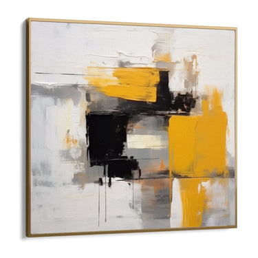 Il quadro presenta una composizione astratta dove il colore giallo domina la scena, esplodendo in varie direzioni e creando un effetto visivo di grande impatto. Le tonalità di nero e grigio aggiungono profondità e contrasto, bilanciando la vivacità del giallo.