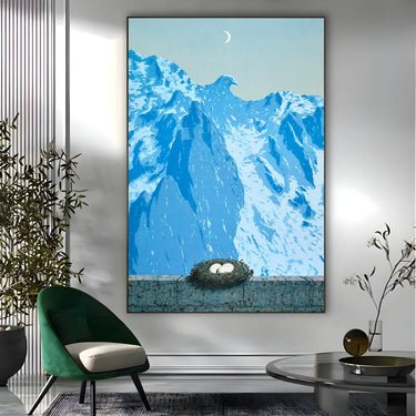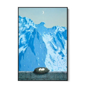 "Il dominio di Arnheim" di René Magritte è una stampa su tela che cattura l'essenza del surrealismo. L'opera rappresenta un paesaggio montano con cime innevate, dove una delle montagne assume la forma di un'aquila maestosa. In primo piano, si trova un nido con due uova posizionato su un muretto di pietra.