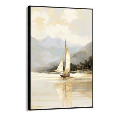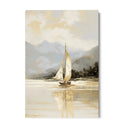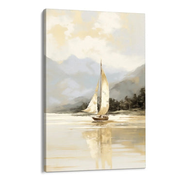 Questa stampa su tela rappresenta una scena serena e suggestiva di una barca a vela che solca placidamente le acque tranquille di un lago. Sullo sfondo, si intravedono montagne maestose avvolte da una leggera foschia, creando un'atmosfera di pace e tranquillità.