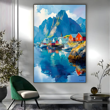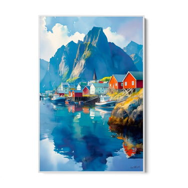 "Montagne nella Luce" è una splendida stampa su tela che cattura l'essenza di un tranquillo villaggio costiero incorniciato da maestose montagne. Le case colorate, prevalentemente in rosso e bianco, si riflettono nelle acque cristalline del fiordo, creando un effetto visivo mozzafiato.
