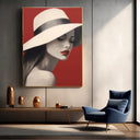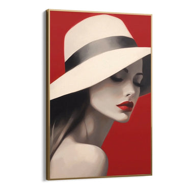 "Seducente rosso" è una stampa su tela che cattura l'essenza dell'eleganza e della raffinatezza. Il quadro rappresenta una donna con un grande cappello bianco a tesa larga, che copre parzialmente il suo viso. La sua espressione è serena e misteriosa, con le labbra dipinte di un rosso intenso che risalta sullo sfondo.