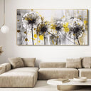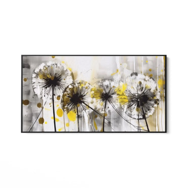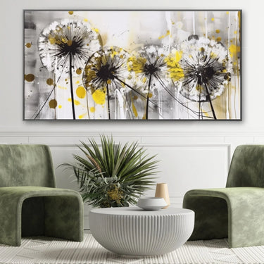 "Soffioni Gialli" è una stampa su tela che cattura la bellezza eterea dei soffioni. Questo quadro rappresenta quattro soffioni stilizzati, con i loro semi pronti a volare via al primo soffio di vento. La composizione è dinamica e affascinante, trasmettendo un senso di leggerezza e movimento.