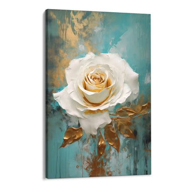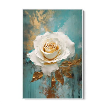 La rosa bianca, simbolo di eleganza e raffinatezza, è il punto focale dell'opera. Le foglie dorate che la circondano aggiungono un tocco di lusso e contrastano magnificamente con i toni più freddi dello sfondo.
