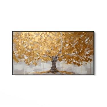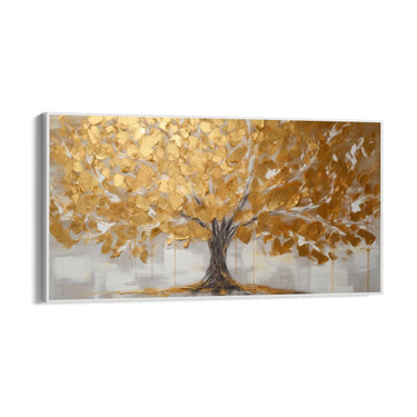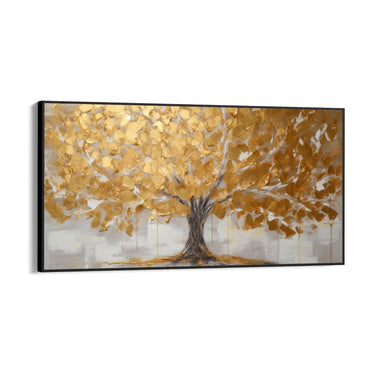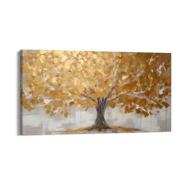 Il quadro "Albero della Felicità" è una stampa su tela che rappresenta un maestoso albero dorato. I rami si estendono ampiamente, coperti da foglie dorate che brillano con eleganza e calore. La base dell'albero è robusta e ben definita, creando un forte contrasto con lo sfondo delicato e sfumato.