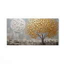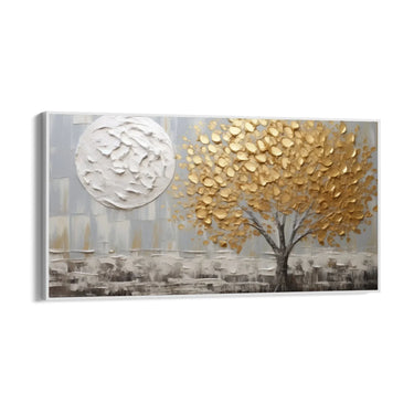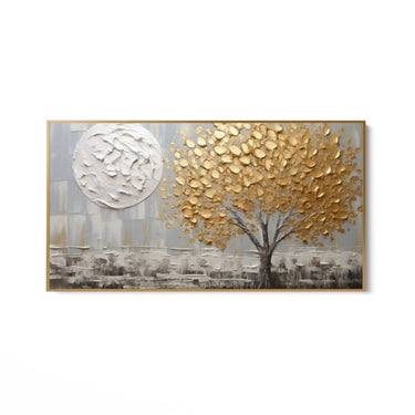 L'albero è rappresentato con grande cura nei dettagli, con foglie dorate che sembrano quasi tridimensionali grazie alla tecnica di pittura effetto rilievo. Lo sfondo, con le sue tonalità neutre, mette in risalto l'albero e il sole, facendo emergere la loro luminosità.