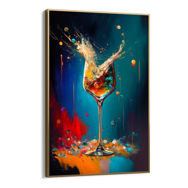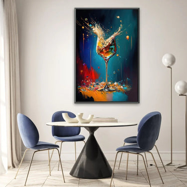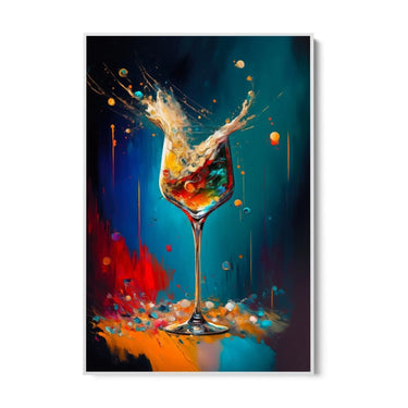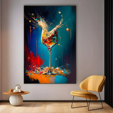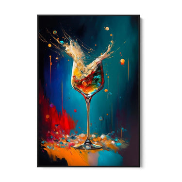 Il quadro "Emozioni liquide" è una stampa su tela che cattura un momento di pura energia e vivacità. Al centro della composizione, un calice di vino sembra esplodere in una danza di colori, con schizzi e gocce che si espandono verso l'esterno.