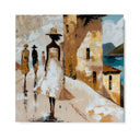 "Sere d'Estate" è una splendida stampa su tela che cattura l'essenza di una serata estiva. La scena ritrae figure eleganti che passeggiano lungo una strada pittoresca, con edifici dal fascino antico sullo sfondo. La figura centrale, vestita con un abito bianco leggero e un cappello di paglia, trasmette un senso di grazia e tranquillità.