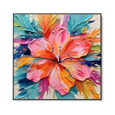 Questa opera d'arte rappresenta un fiore in piena fioritura, simbolo di vitalità e rinascita. I petali sono dipinti con pennellate spesse e decise, che conferiscono profondità e movimento al soggetto. Ogni dettaglio del fiore è curato con precisione, dalle venature dei petali ai pistilli centrali.