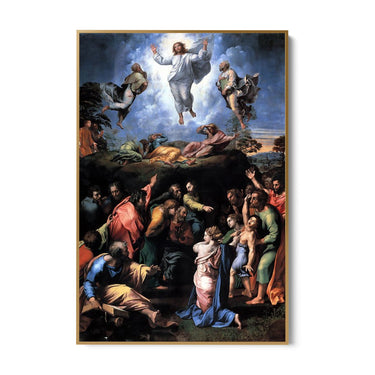 "Trasfigurazione" di Raffaello Sanzio è una delle opere più celebri del Rinascimento italiano. Questo capolavoro rappresenta la scena biblica della trasfigurazione di Cristo sul Monte Tabor. La composizione è divisa in due registri principali: nella parte superiore, Cristo è raffigurato in un'aura di luce, fluttuante tra le nuvole, accompagnato dai profeti Mosè ed Elia. Nella parte inferiore, gli apostoli e altre figure sono raffigurati in atteggiamenti di stupore e adorazione.