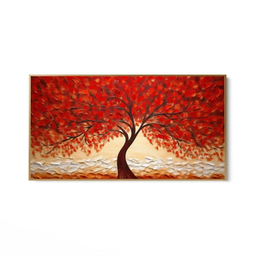 Il quadro trasmette un senso di calore e passione, evocando immagini di autunno e romanticismo. L'albero, simbolo di vita e crescita, con le sue foglie ardenti, può essere visto come un emblema di amore eterno e forza interiore. La texture della tela aggiunge un ulteriore livello di realismo, rendendo ogni foglia e ramo quasi tangibili.