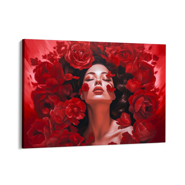Questo quadro rappresenta la fusione tra la bellezza femminile e la forza della natura. I petali di rose rosse che circondano il volto della donna sembrano quasi fondersi con i suoi capelli, creando un'aura di mistero e fascino. L'uso predominante del rosso suggerisce emozioni intense come l'amore, la passione e il desiderio, rendendo questa opera un pezzo d'arte che cattura lo sguardo e l'immaginazione.