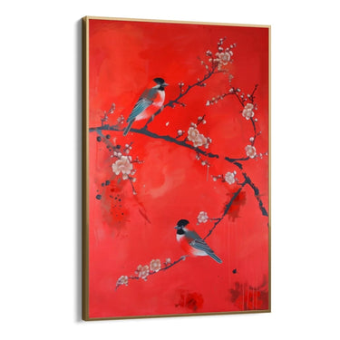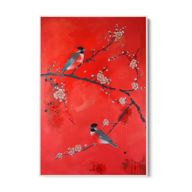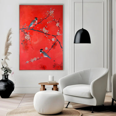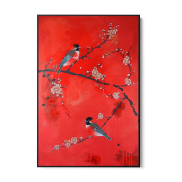 "Rosso tra i passeri" è una stampa su tela che cattura l'attenzione con la sua vivace e intensa tonalità di rosso. Il quadro rappresenta due passeri posati su rami fioriti, creando un contrasto affascinante tra il colore acceso dello sfondo e i dettagli delicati degli uccelli e dei fiori.