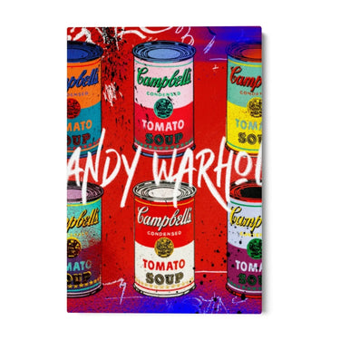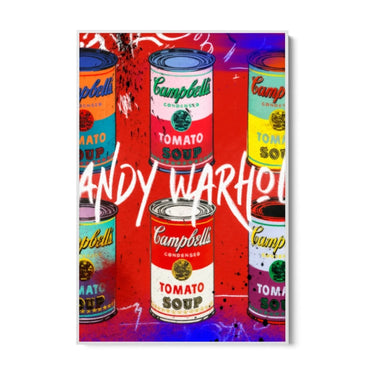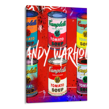 Questa stampa su tela rappresenta un'opera iconica di arte pop, ispirata al celebre lavoro di Andy Warhol. Il soggetto principale del quadro sono le famose lattine di zuppa Campbell's, disposte in una composizione vivace e colorata.