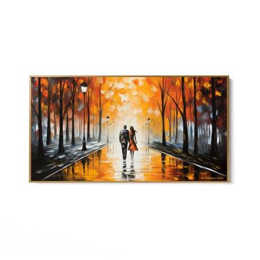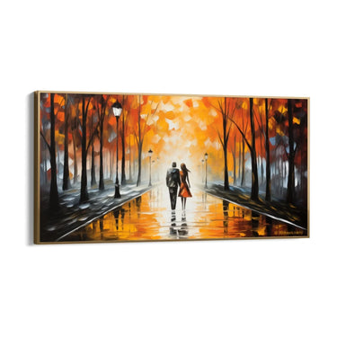 La scena rappresenta una coppia che cammina insieme in una giornata autunnale, simbolo di un viaggio condiviso e di un legame profondo. Gli alberi spogli e il riflesso dell'acqua sul viale suggeriscono una pioggia recente, aggiungendo un ulteriore strato di romanticismo e introspezione al dipinto.