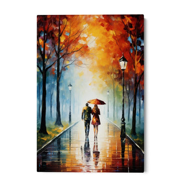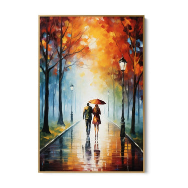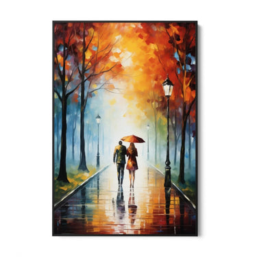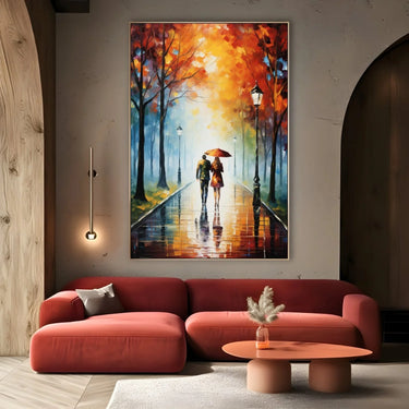 "Insieme nella Vita" è una stampa su tela che cattura un momento di intimità e serenità tra due persone che camminano sotto la pioggia. Il quadro rappresenta una coppia che passeggia mano nella mano lungo un viale alberato, riparandosi sotto un ombrello rosso. L'atmosfera è resa ancora più romantica dalla luce soffusa dei lampioni che illumina il percorso.
