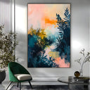I colori dominanti sono il verde scuro e il blu, che rappresentano la vegetazione rigogliosa del bosco. Questi toni profondi sono contrastati da tocchi di giallo e arancione, che evocano la luce del sole al tramonto. Il rosa e il pesca aggiungono un tocco di calore e delicatezza, bilanciando la composizione cromatica.
