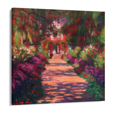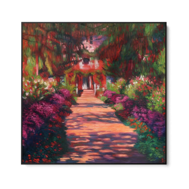 Questa stampa su tela rappresenta uno dei meravigliosi giardini dipinti da Claude Monet. Il sentiero centrale, illuminato dalla luce del sole, guida l'occhio dello spettatore attraverso un'esplosione di colori vivaci e naturali.