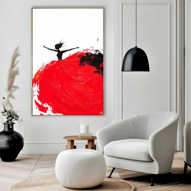 I colori predominanti sono il rosso acceso e il nero, che contrastano magnificamente con lo sfondo bianco. Il rosso, simbolo di passione e vitalità, domina la scena, mentre il nero aggiunge profondità e intensità all'opera.