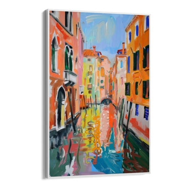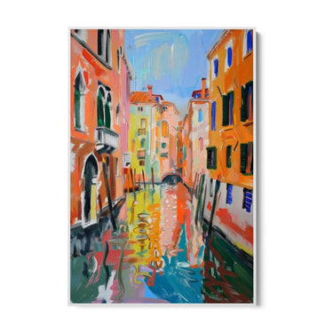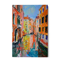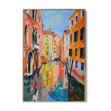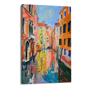 "Evocazioni tra i canali" è una stampa su tela che cattura l'essenza vibrante di un canale veneziano. La scena ritrae edifici storici che si affacciano sull'acqua, con le loro facciate colorate che riflettono nel canale sottostante.