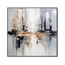 Il quadro sembra rappresentare una scena urbana stilizzata, con strutture verticali che ricordano grattacieli riflessi in una superficie d'acqua. Le linee sfocate e le pennellate decise creano un effetto di fluidità e transizione, suggerendo una città in continuo cambiamento.