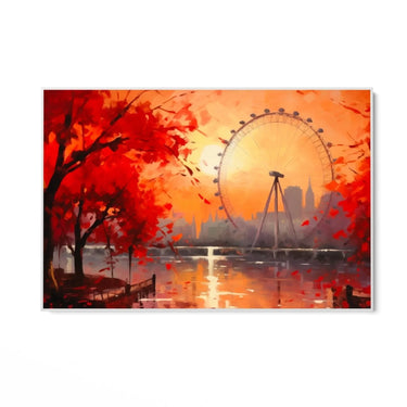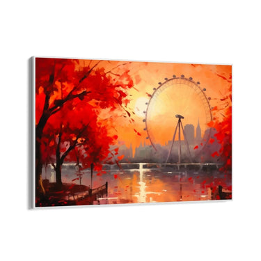 Il quadro "Paesaggio Intangibile" è una straordinaria stampa su tela che cattura l'essenza di un tramonto urbano. La scena rappresenta una ruota panoramica imponente, probabilmente il London Eye, che si staglia contro un cielo infuocato al tramonto.