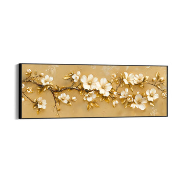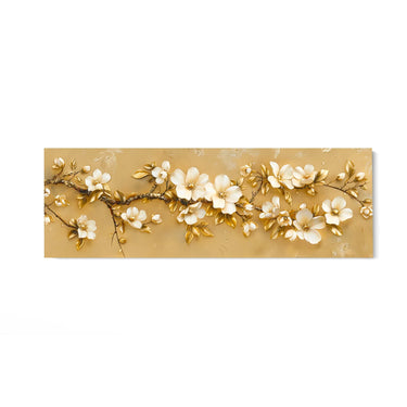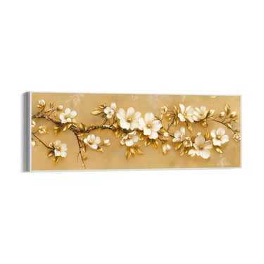 "Petali di Sole" è una stampa su tela che cattura la bellezza delicata dei fiori in piena fioritura. I petali bianchi e dorati si dispongono armoniosamente su uno sfondo dorato, creando un effetto visivo elegante e raffinato.