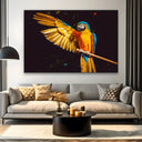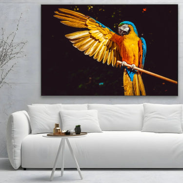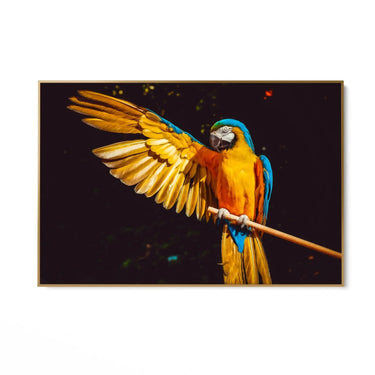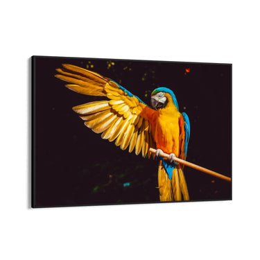 I colori predominanti nel quadro sono il giallo brillante delle piume dell'ala, l'arancione intenso del corpo e il blu vibrante delle penne della coda e delle ali. Lo sfondo scuro mette in risalto i colori vivaci del pappagallo, creando un contrasto che rende l'immagine ancora più affascinante e dinamica.