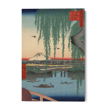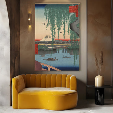 Questa stampa su tela rappresenta un paesaggio sereno e suggestivo, tipico dell'arte giapponese. In primo piano si notano rami di salice piangente che scendono delicatamente verso l'acqua, creando un effetto di tranquillità e armonia. Sullo sfondo, il maestoso Monte Fuji si erge con la sua cima innevata, simbolo iconico del Giappone.