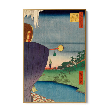 La scena include dettagli intricati come lanterne sospese e piccoli elementi architettonici che arricchiscono la composizione. La presenza di questi elementi suggerisce un ambiente tranquillo e contemplativo, tipico delle stampe tradizionali giapponesi.