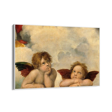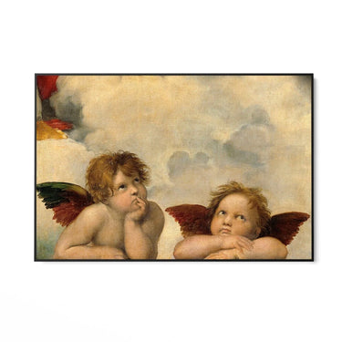 Tento tisk na plátně zobrazuje dva cherubínské anděly, detail slavného obrazu "Madonna Sistina" od Raffaella Sanzia. Andělé jsou zobrazeni v kontemplativní póze, s hlavami opřenými o ruce a pohledem směřujícím vzhůru. Jejich zamyšlené a snové výrazy dodávají dílu nádech nevinnosti a klidu.