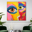 Obraz "Iride Ipnotica" je tisk na plátně, který okamžitě upoutá pozornost svými živými barvami a odvážným designem. Kompozice představuje dva velké a stylizované oči, které se zdají intenzivně sledovat diváka, vytvářející hypnotický efekt.