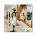 "Sere d'Estate" je nádherná tisk na plátně, který zachycuje podstatu letního večera. Scéna zobrazuje elegantní postavy procházející se malebnou ulicí, s budovami starobylého kouzla v pozadí. Centrální postava, oblečená v lehkých bílých šatech a slaměném klobouku, vyzařuje pocit půvabu a klidu.