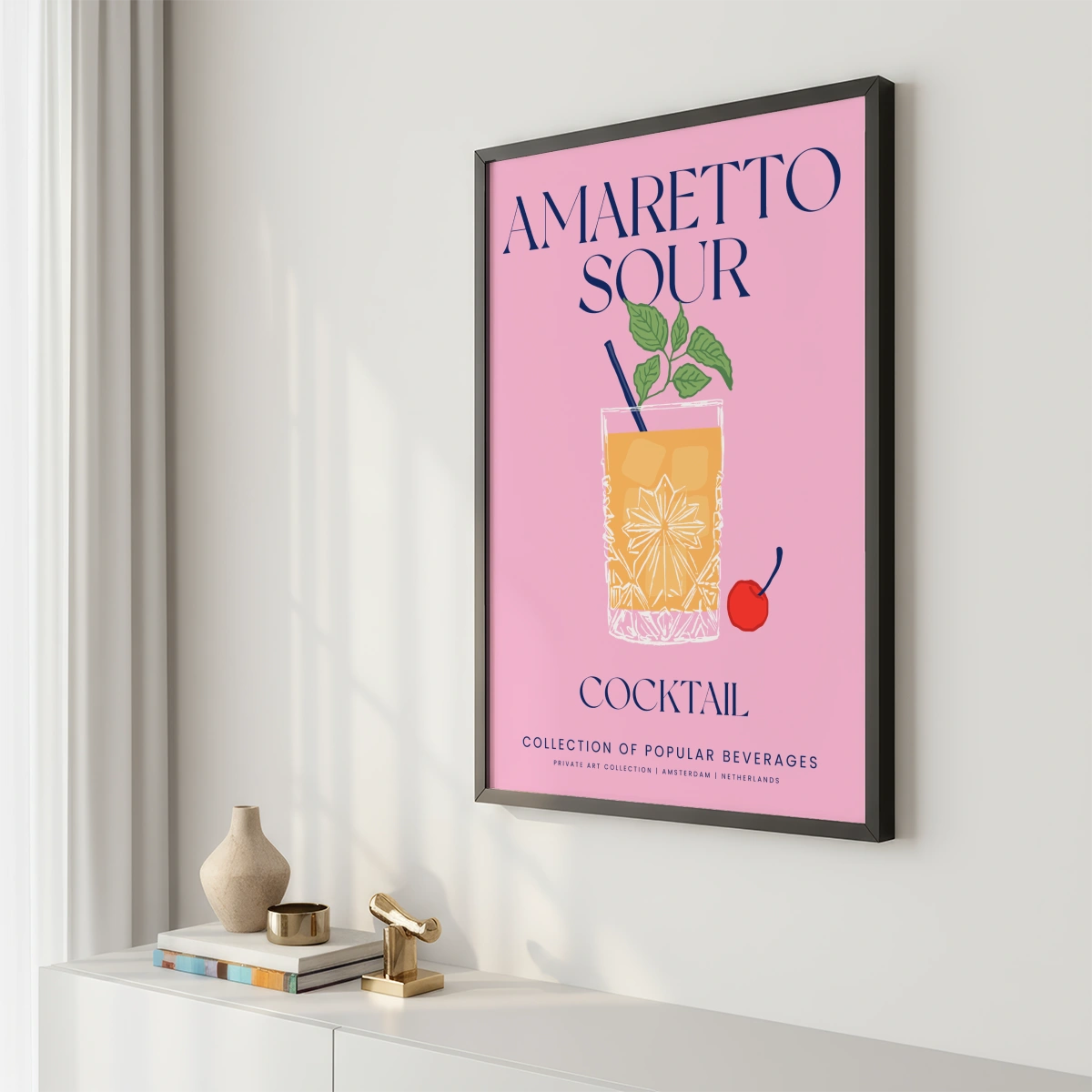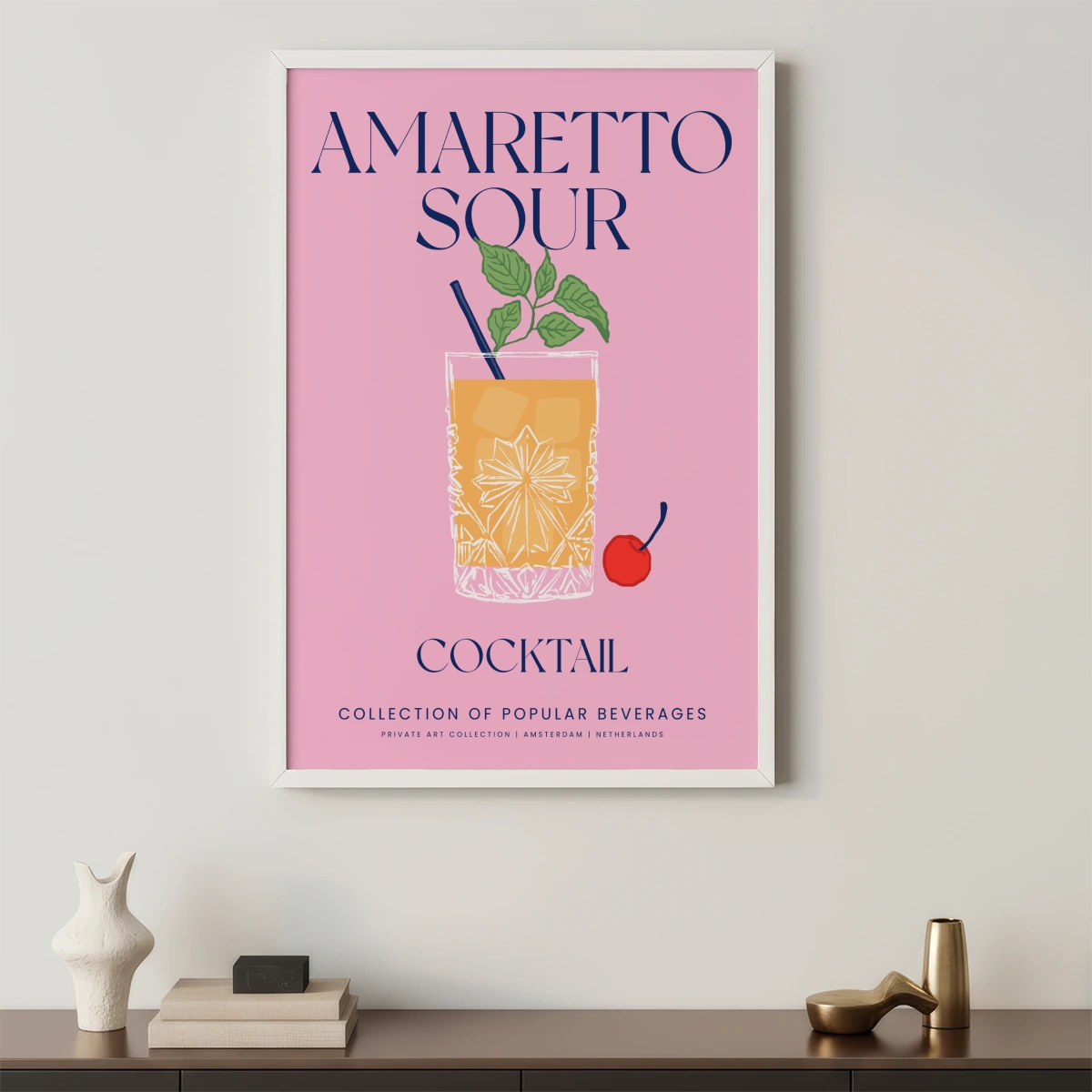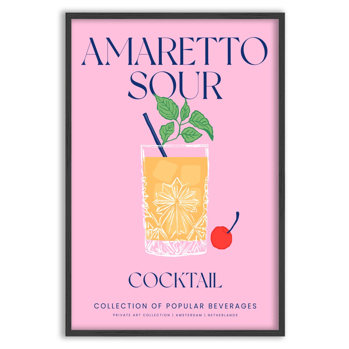 Pod obrázkem koktejlu je text "COLLECTION OF POPULAR BEVERAGES" a "PRIVATE ART COLLECTION" | AMSTERDAM | "NETHERLANDS" poskytují elegantní a sofistikovaný kontext, naznačující, že Plakát je součástí soukromé umělecké sbírky věnované populárním nápojům.