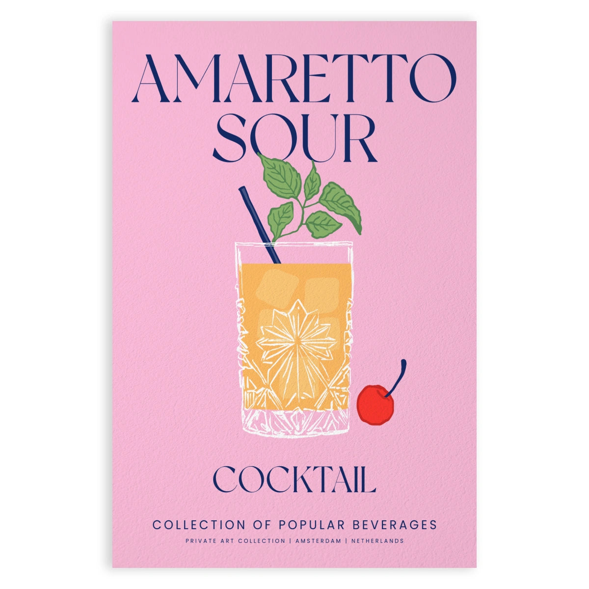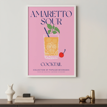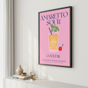 Tento Plakát zobrazuje koktejl Amaretto Sour, klasický drink známý svou sladkou a mírně kyselou chutí. Ústřední obrázek ukazuje sklenici zdobenou elegantním vzorem, naplněnou žluto-oranžovým nápojem. Nad sklenicí jsou čerstvé zelené listy, které dodávají ilustraci živost. Vedle sklenice je červená třešeň, ikonický symbol mnoha koktejlů.