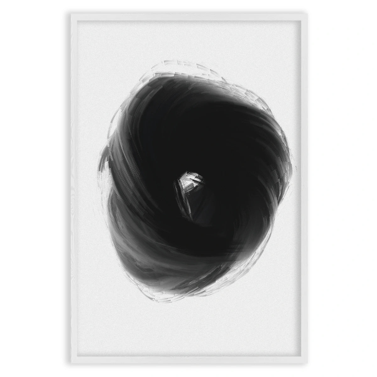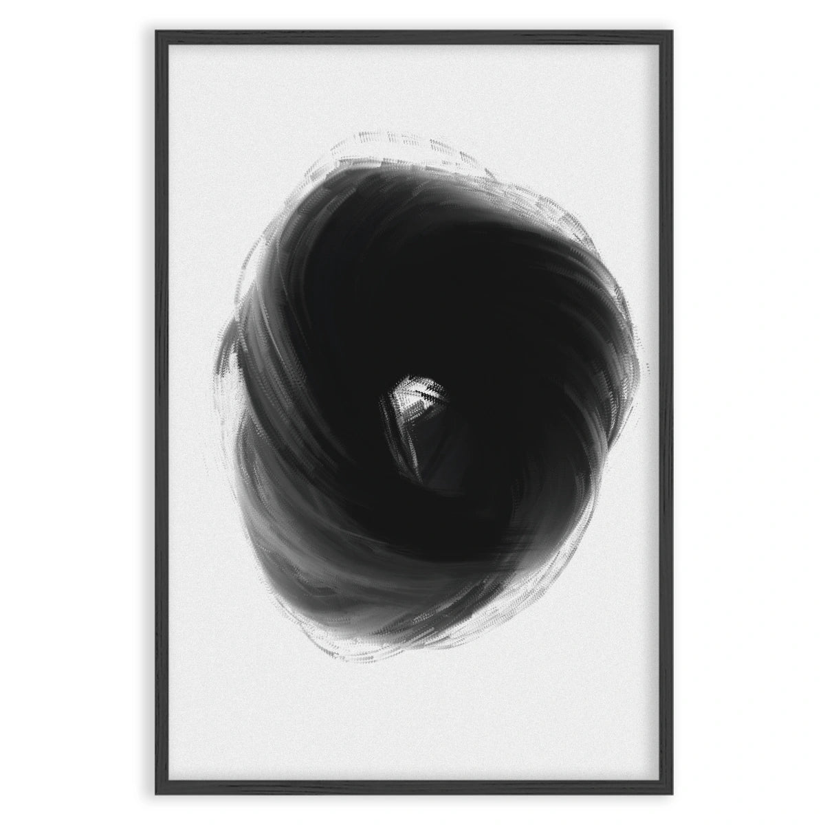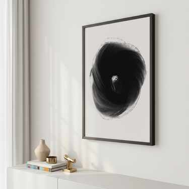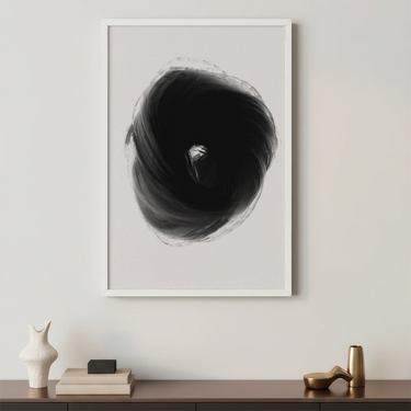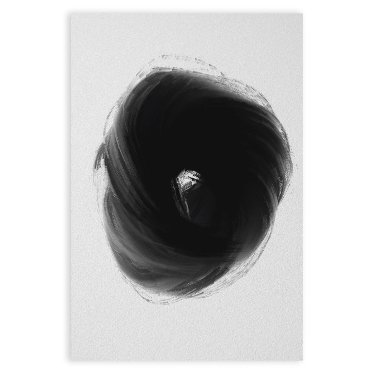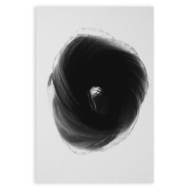 Plakát "Buio Totale" představuje temný vortex, který upoutává pozornost svou intenzitou a hloubkou. Minimalistický design využívá kombinaci odstínů černé a šedé k vytvoření dynamického a poutavého vizuálního efektu.