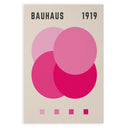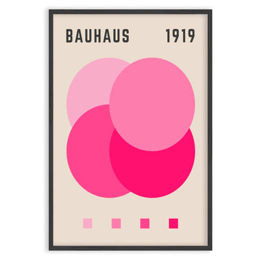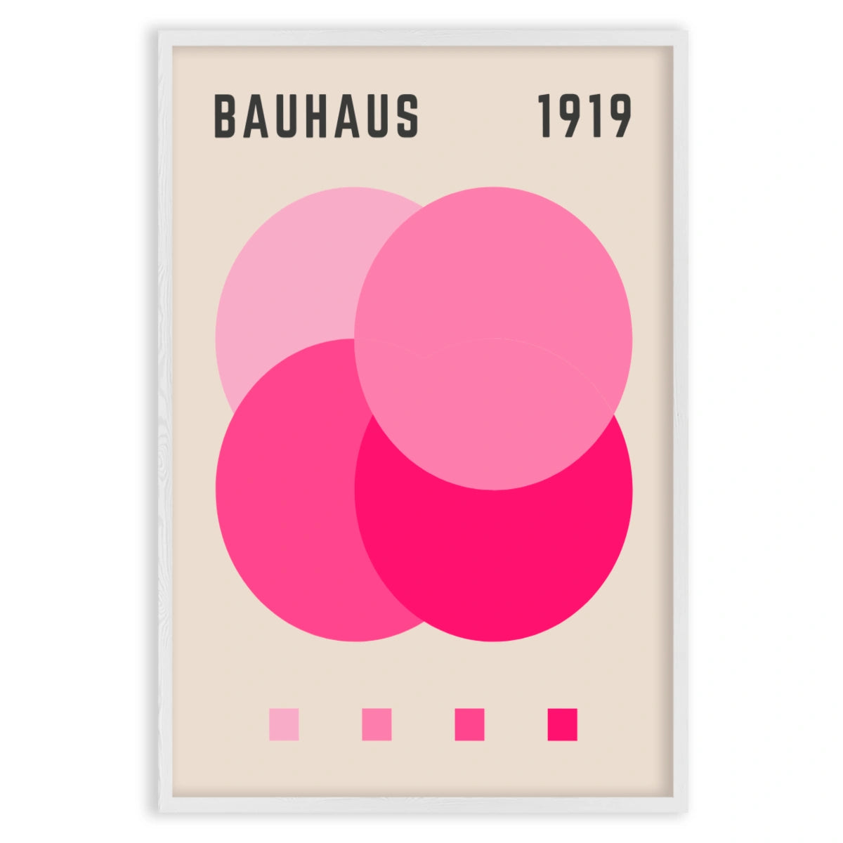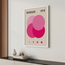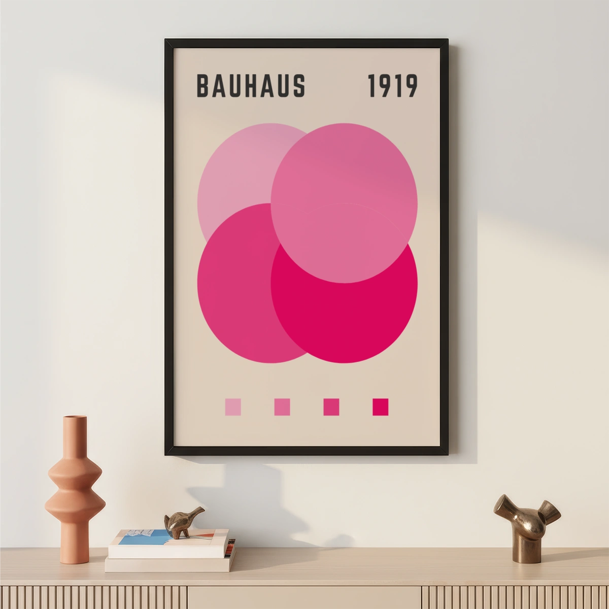 Plakát "Dvojitý kruh" je poctou estetice Bauhausu z roku 1919. Má minimalistický design se dvěma překrývajícími se kruhy v různých odstínech růžové, od světle růžové po intenzivní fuchsii. Kompozice je jednoduchá, ale působivá, ideální pro přidání doteku moderní elegance do jakéhokoli prostředí.