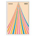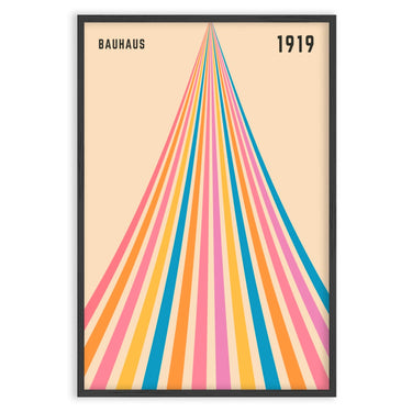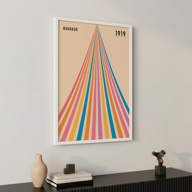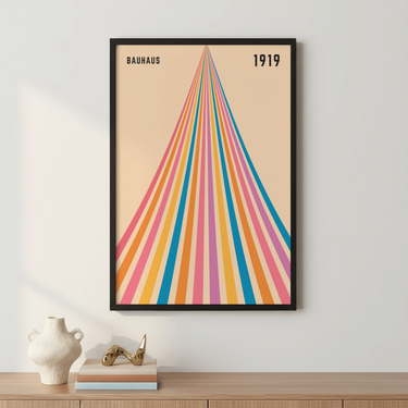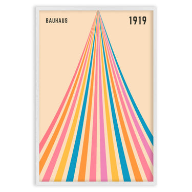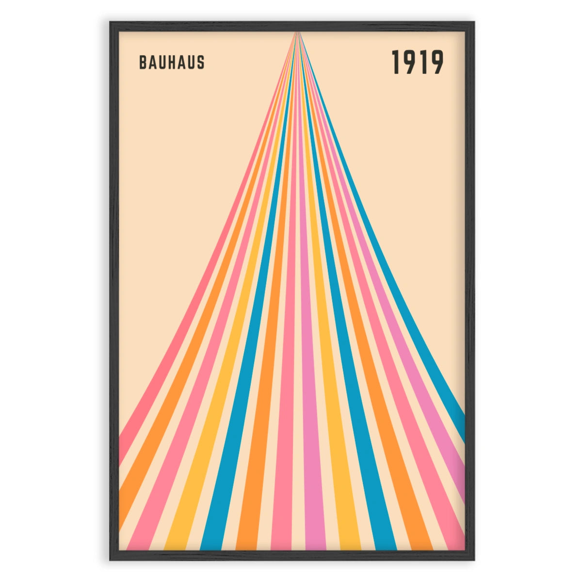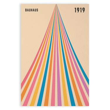 Plakát "Fascio Ascendente" je umělecké dílo inspirované hnutím Bauhaus, jak naznačuje nápis "Bauhaus" vlevo nahoře a rok "1919" vpravo nahoře. Tento minimalistický a geometrický design představuje svazek barevných linií, které se rozšiřují směrem vzhůru, vytvářející dynamický a poutavý vizuální efekt.